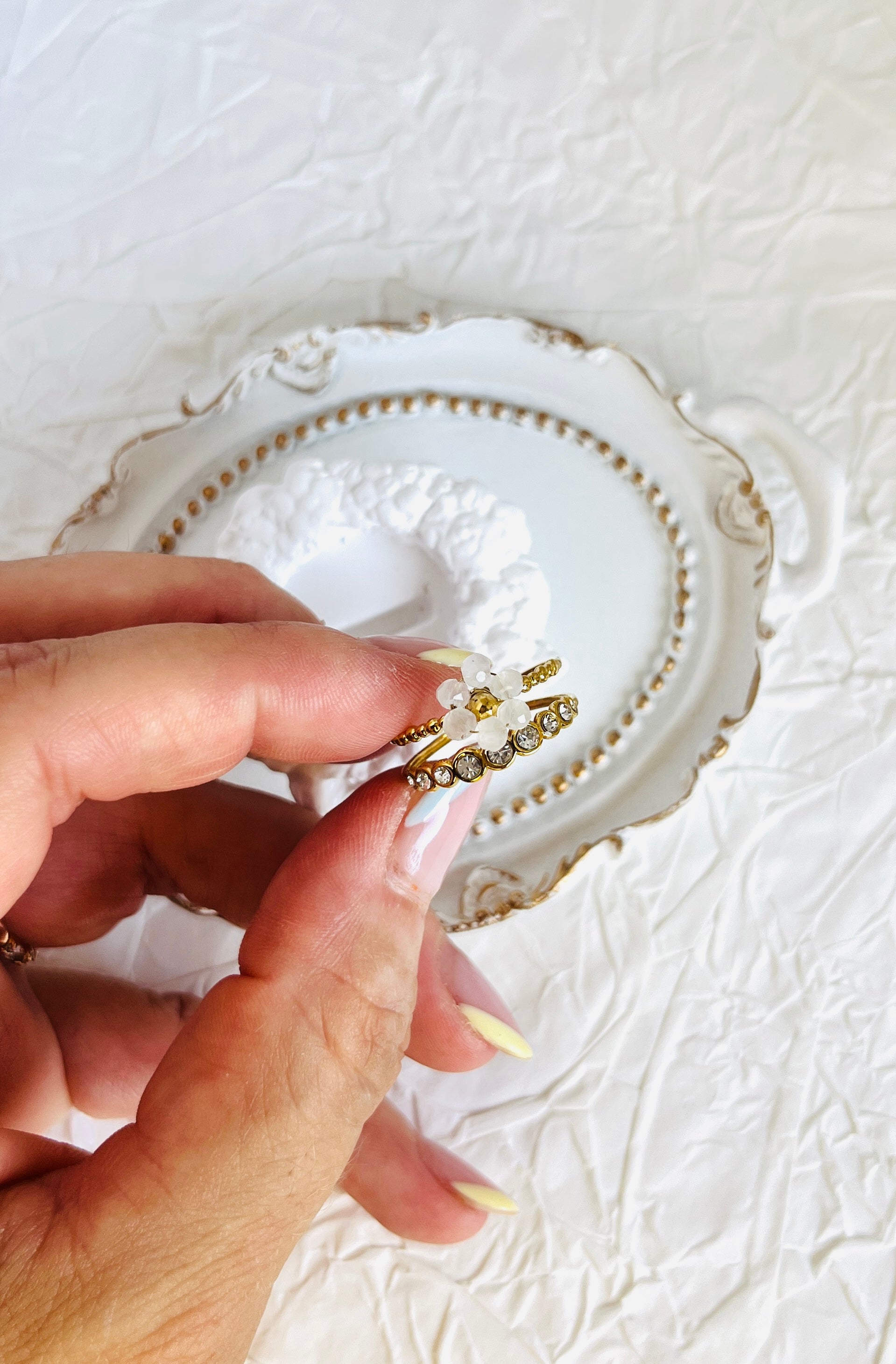 Doble Anillo Flora, en acero inoxidable color oro, este doble anillo combina brillantes blancos con una delicada margarita en pequeñas piedras, creando un diseño romántico y femenino. Inspirado en la diosa romana de las flores y la primavera, simboliza belleza, frescura y alegría, perfecto para mujeres que buscan un toque elegante y delicado. La talla única, se adapta.