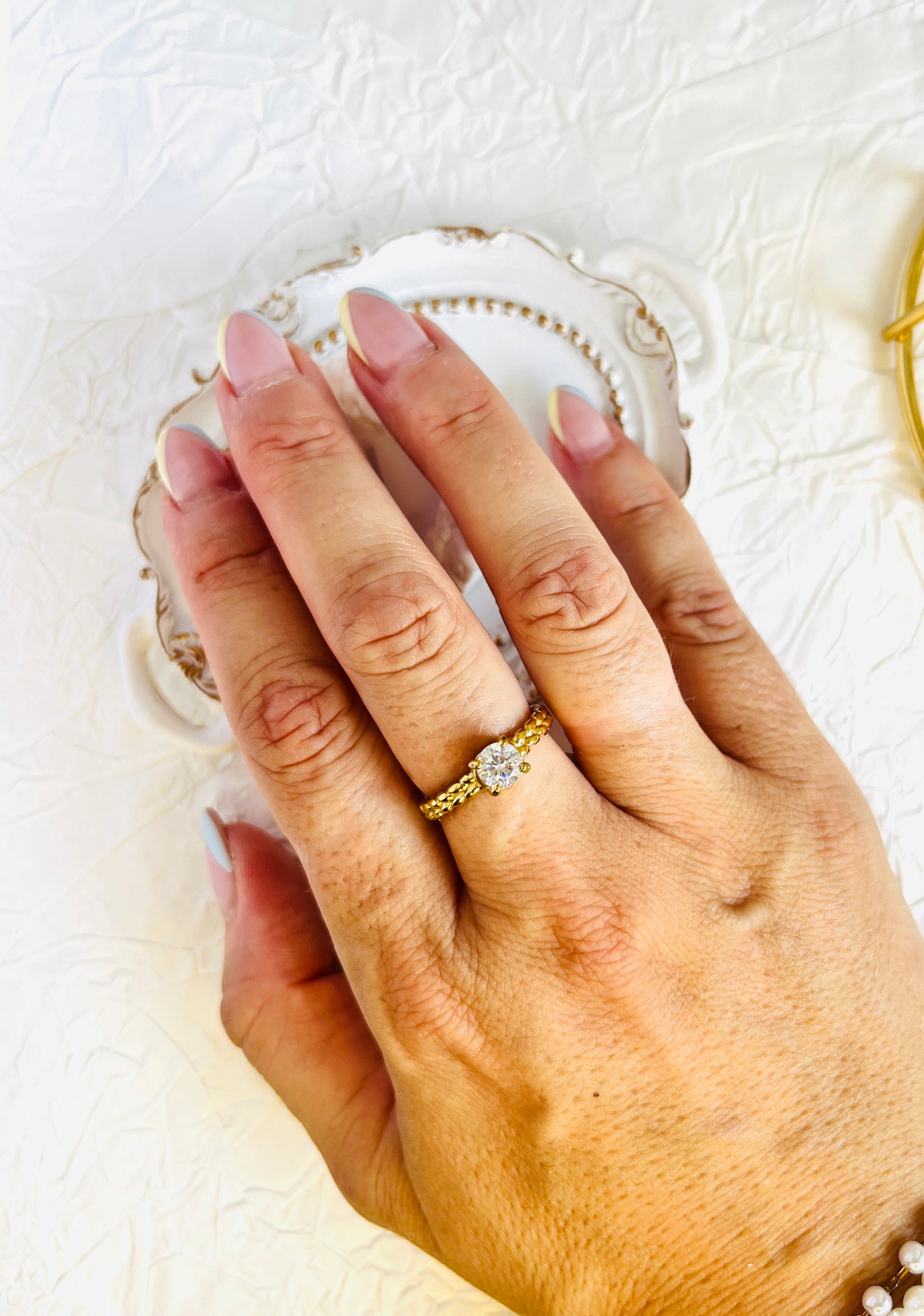 Anillo Freya, en acero inoxidable, con diseño en forma de cadena que simboliza fuerza y conexión, realzado por un brillante central al estilo solitario. Inspirado en la diosa nórdica del amor y la belleza, representa elegancia, poder y feminidad, ideal para mujeres que buscan un toque sofisticado y distintivo. Talla comprendida entre la 11-12 (16,2 a 16,6mm).