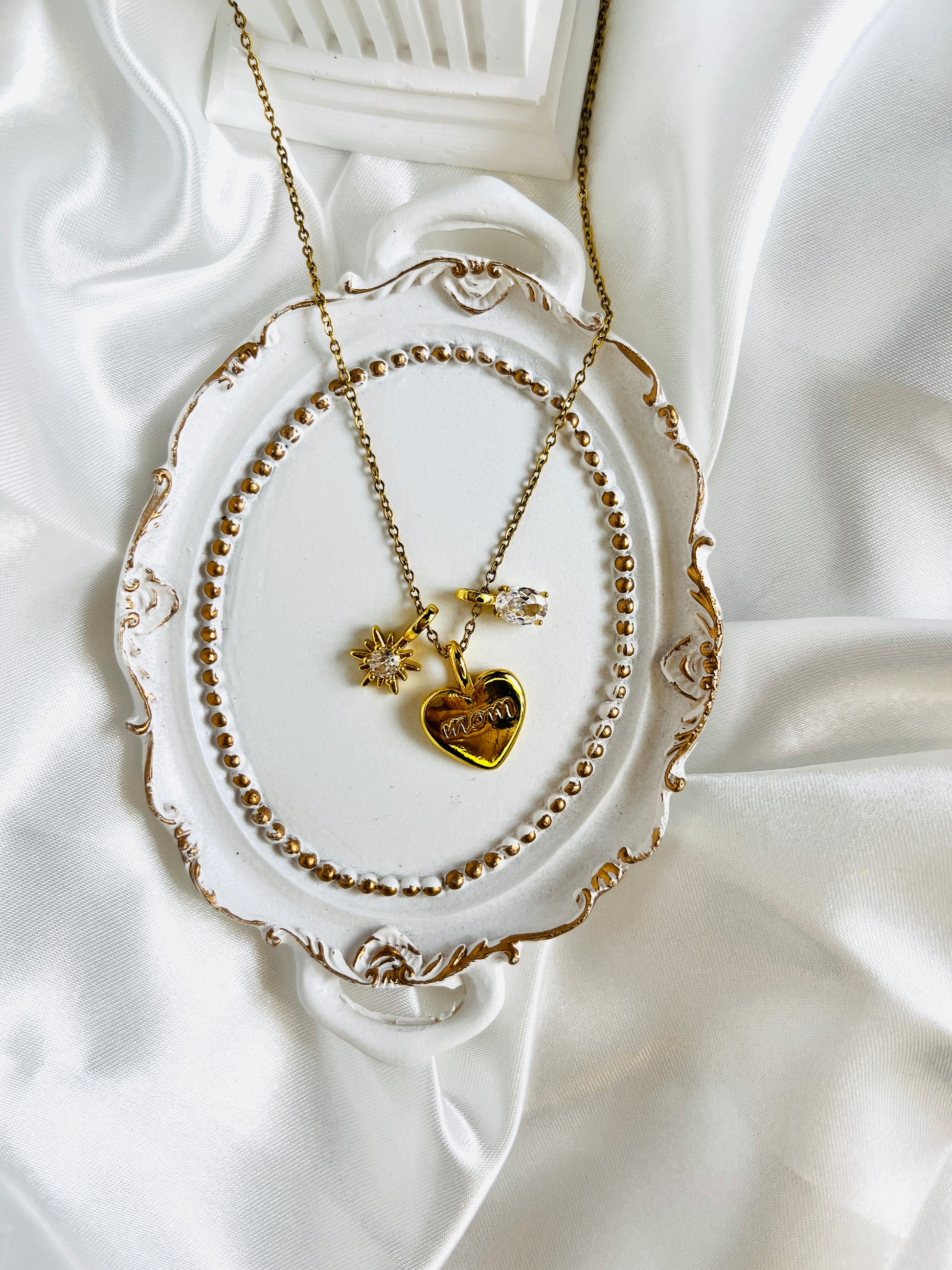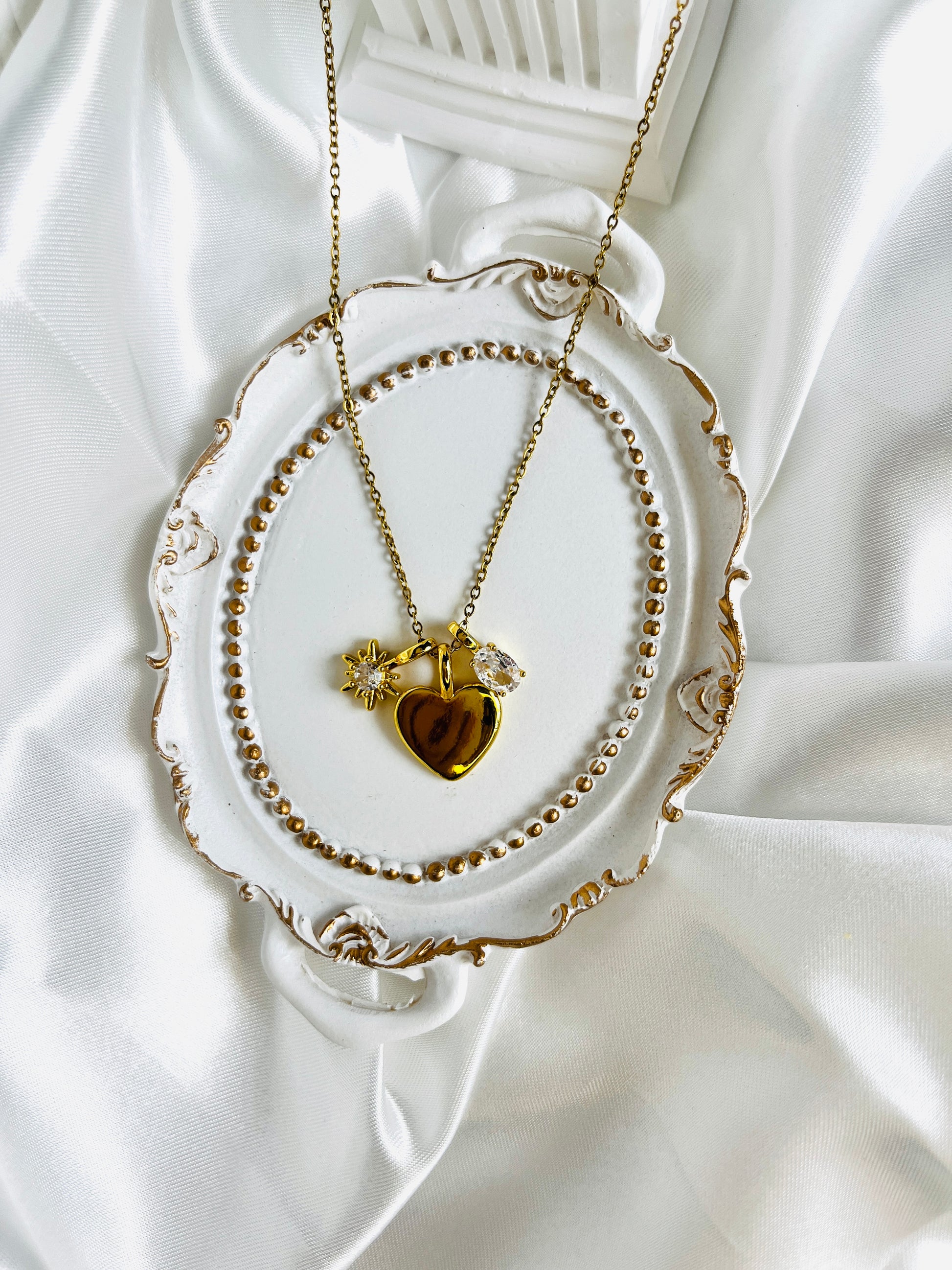 El Collar Aura es una joya de bisutería fina, elegante y sofisticada. Con dos delicados colgantes con brillantes y un tercer colgante en forma de corazón, esta pieza evoca la belleza sutil de los cerezos en flor. Perfecto para mujeres que valoran los detalles con significado, combina luz, romanticismo y estilo en un solo diseño. Ideal para realzar cualquier look con un toque de dulzura y distinción.