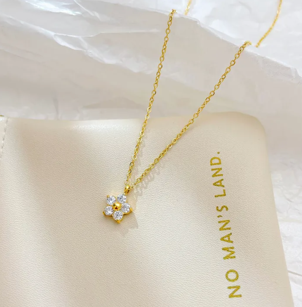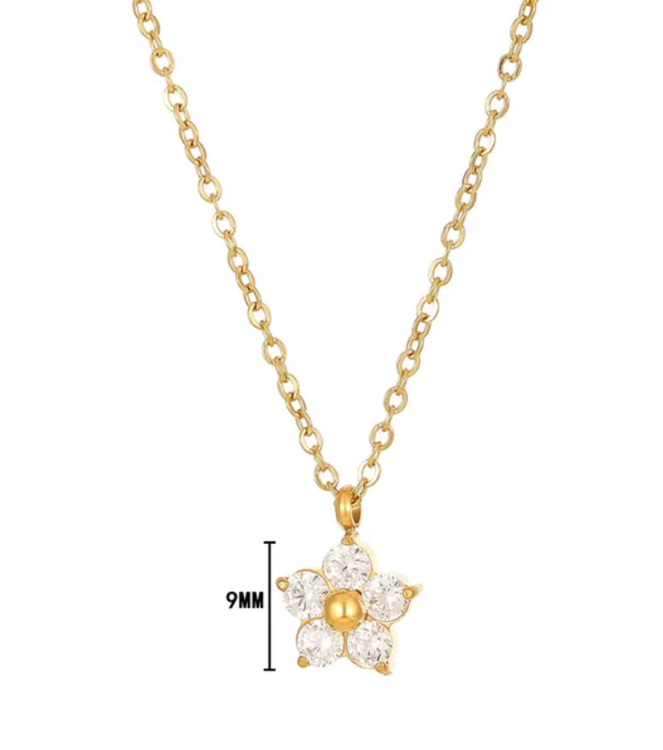 Elegante collar dorado con una delicada flor colgante adornada con circonitas blancas. Femeninos, clásicos y con un toque romántico. Disponible pendientes a juego Austen.