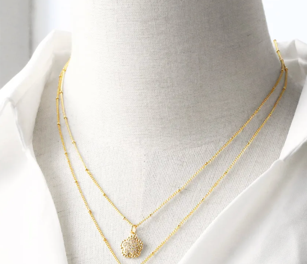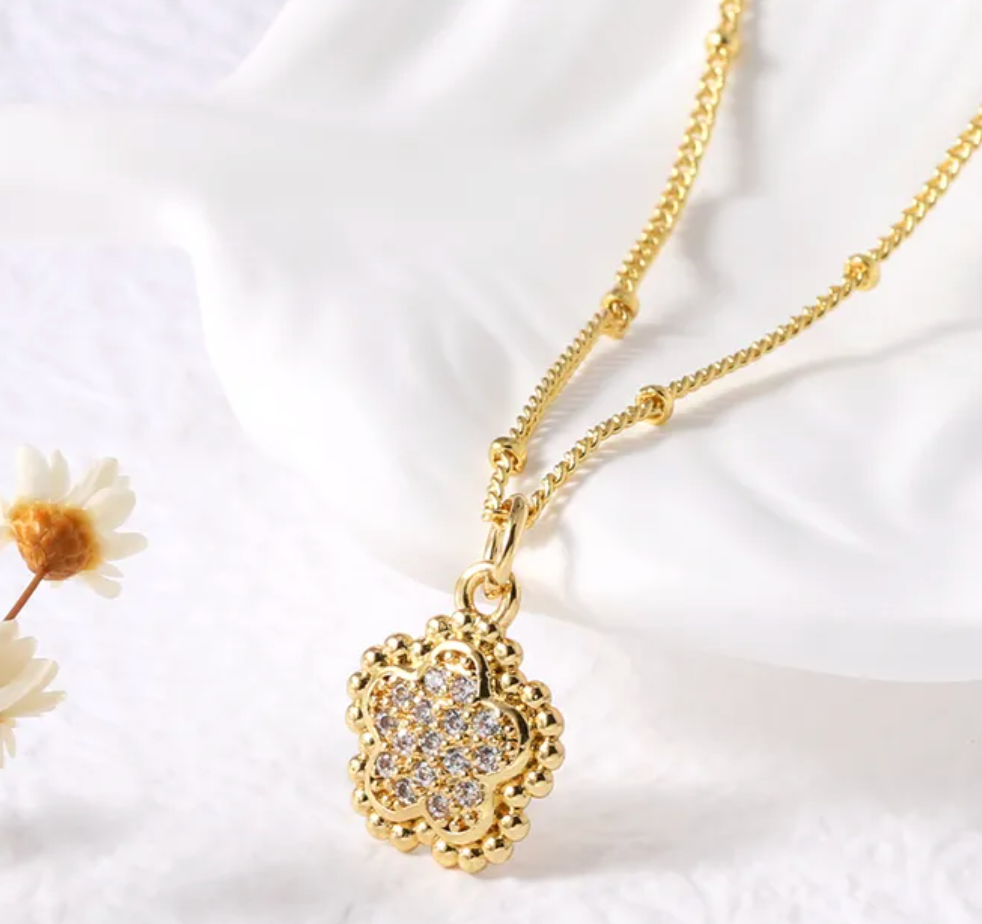 Collar en acero inoxidable chapado en oro, con un delicado colgante de flor adornado con circonitas que capturan la luz con elegancia. Femenino, sutil y con un toque de magia.