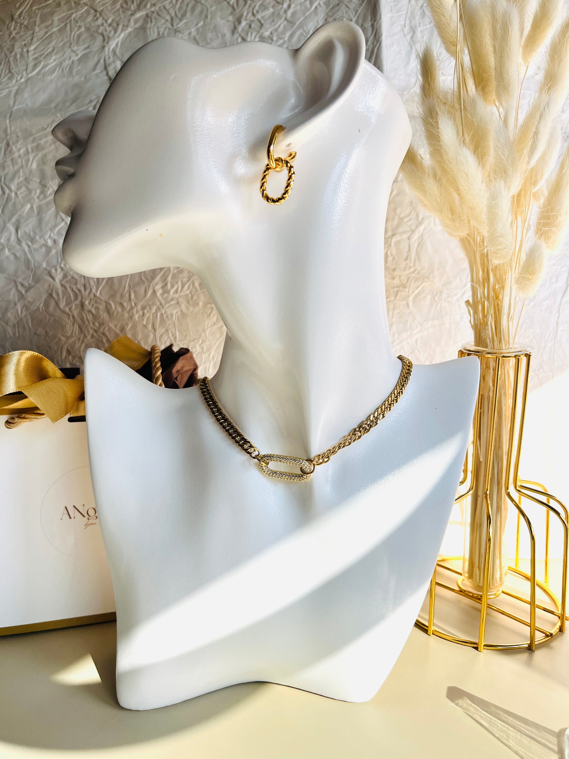 El Collar Minerva está elaborado en acero inoxidable color oro y destaca por su elegante cadena con un delicado detalle geométrico adornado con brillantes. Inspirado en la diosa de la sabiduría y la estrategia, simboliza inteligencia, fuerza y estilo. Una joya moderna y sofisticada, ideal para mujeres que desean brillar con distinción.