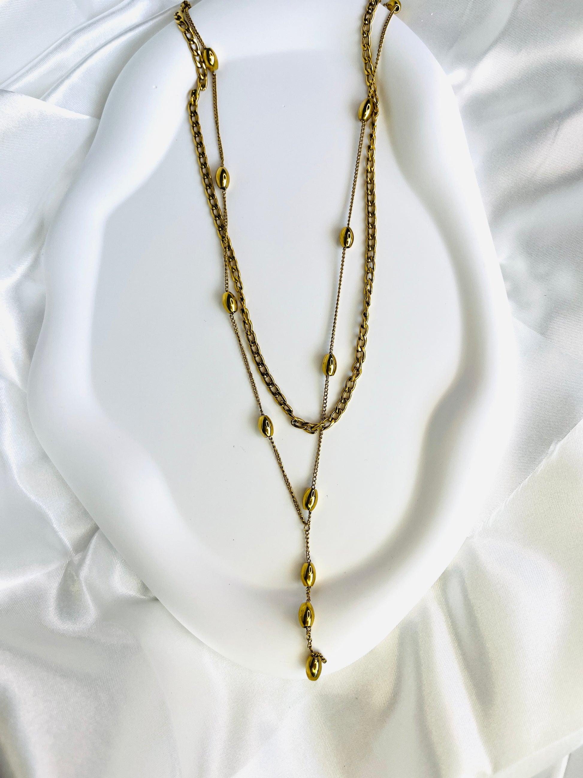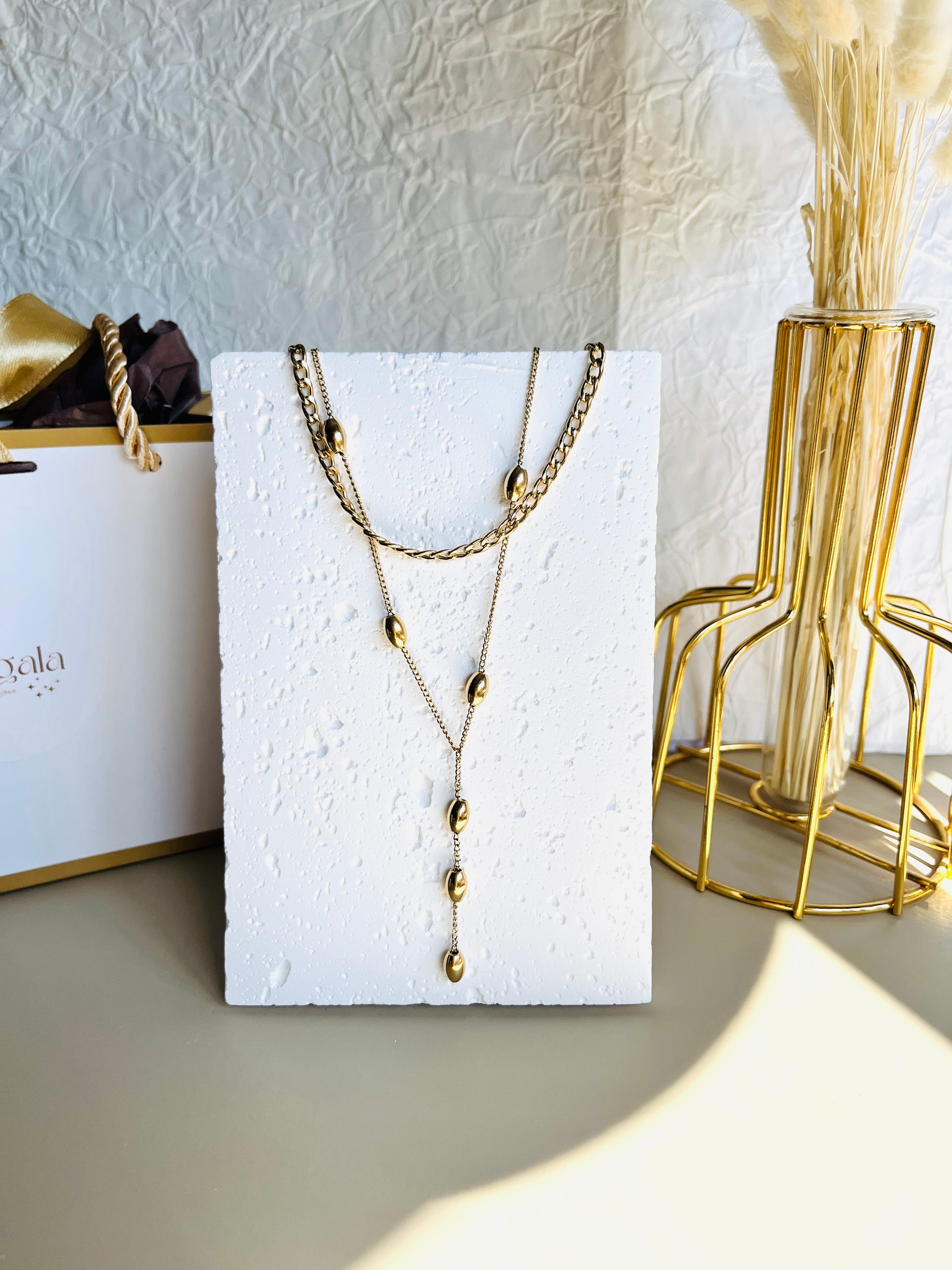 El Collar Selene es un elegante diseño doble en acero inoxidable color oro, pensado para mujeres que buscan sofisticación y estilo. Una de sus cadenas luce delicadas borlas que aportan movimiento y brillo sutil. Inspirado en la diosa lunar, símbolo de feminidad, luz y encanto atemporal en cualquier ocasión.